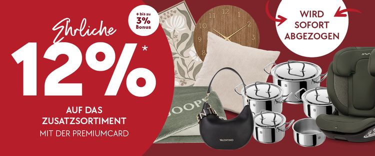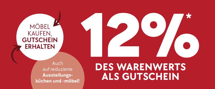 *Beim Kauf von Möbeln (auch Gartenmöbel) im Wert ab 500 € erhalten Sie 12% des Warenwerts als Gutschein – der Betrag wird nicht direkt abgezogen, sondern als Warengutschein ausgestellt. Auf Artikel aus dem Sortiment Haushaltswaren und Wohnaccessoires erfolgt der Abzug direkt an der Kasse. Ausgenommen Produkte von Dinzler und Consenz.Coffee, romanicum, BORA, Berkel, brühl, Hilker, Interliving, Kleinelektro-Haushaltsgeräte, Miele, Musterring, NAPOLEON, ROOMIO, ruf-Betten, Schöner Wohnen, TEAM 7, TEMPUR®, Tommy M, Kleinelektro von WMF, Metall-Pavillons, FC Bayern Fanshop, Starbulls Rosenheim Fanshop. Geschenkgutscheine, Bücher sowie bereits reduzierte und in Prospekten, Mailings und Anzeigen beworbene Ware, die im Haus gekennzeichnet ist. Nicht gültig für bereits bestehende Aufträge, sonstige Prozentaktionen, Sonder-/Maßbestellungen und Nähaufträge bei Heimtextilien, Dienstleistungen, Sonderkonditionen und im Restaurant. Zusätzlich bis zu 3% mit der PremiumCard.