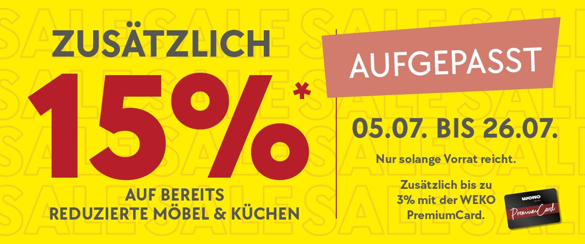 AUFGEPASST! Nur vom 05.07. bis zum 26.07. gibt es bei WEKO zusätzlich 15%* Nachlass auf bereits reduzierte Möbel & Küchen!