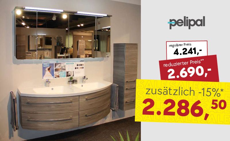 Sangallo grau foliert, bestehend aus: Waschtischunterschrank mit Doppelwaschtisch (ca. 151x48x51 cm), Spiegelschrank (ca. 162x71x22 cm), Midischrank (ca. 30x121x33 cm), Handtuchhalter. Inkl. Armaturen und Beleuchtung.