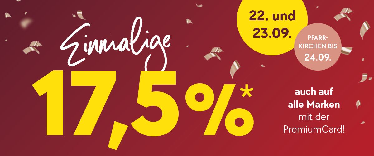 *Ausgenommen Geschenkgutscheine, Bücher sowie bereits reduzierte und in Prospekten, Mailings und Anzeigen beworbene Ware, die im Haus gekennzeichnet ist (die Preise dieser Artikel sind bereits um 17,5% reduziert). Nicht gültig für bereits bestehende Aufträge, sonstige Prozentaktionen, Dienstleistungen, Sonderkonditionen und im Restaurant. Bei Bestellware sind 3% Anzahlungs-Skonto im Rabatt enthalten.