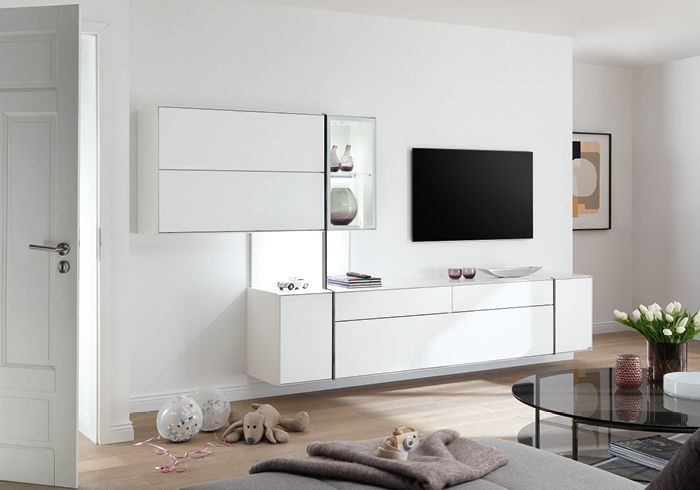 Wohnwand Fonis 980001 - Ob klassisch in Lack reinweiß, Lack grau oder eine der weiteren modernen Farben, die Fonis Serie eignet sich perfekt, um eine harmonische Wohnwelt zu kreieren oder durch einen Farbwechsel spannende und dennoch zurückhaltende Akzente zu setzten.