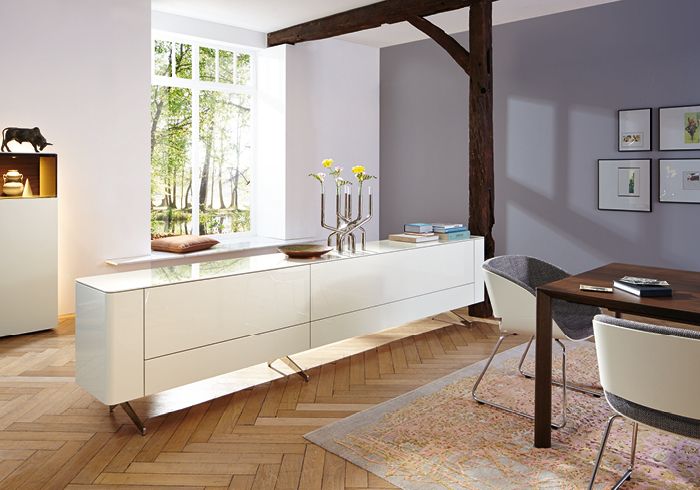 Lowboard von Hülsta, Gentis Ausführung: 648 Lack reinweiß - Lowboard als Raumteiler mit 2 Klappen oben & unten, Metallgestell, Chrom-hochglänzend. Die Rückansicht eines Raumteilers ist identisch mit der Vorderansicht.
