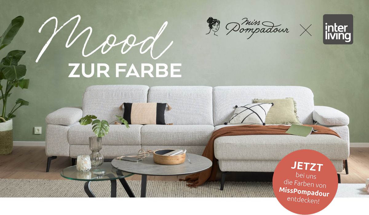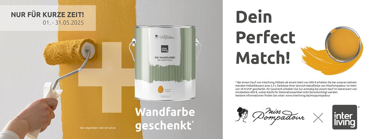 Farben bringen Räume zum Strahlen und verleihen ihnen eine ganz eigene Atmosphäre. Mit Interliving und MissPompadour wird das Gestalten deines Wohnraums zu einem kreativen Erlebnis. Ob sanfte Pastelltöne für eine entspannte Wohlfühlatmosphäre, kräftige Farben für ausdrucksstarke Akzente oder dezente Nuancen für einen eleganten Look – stilvolle Möbel und hochwertige Farben ergänzen sich perfekt und lassen dein Zuhause genau so wirken, wie du es dir wünschst.