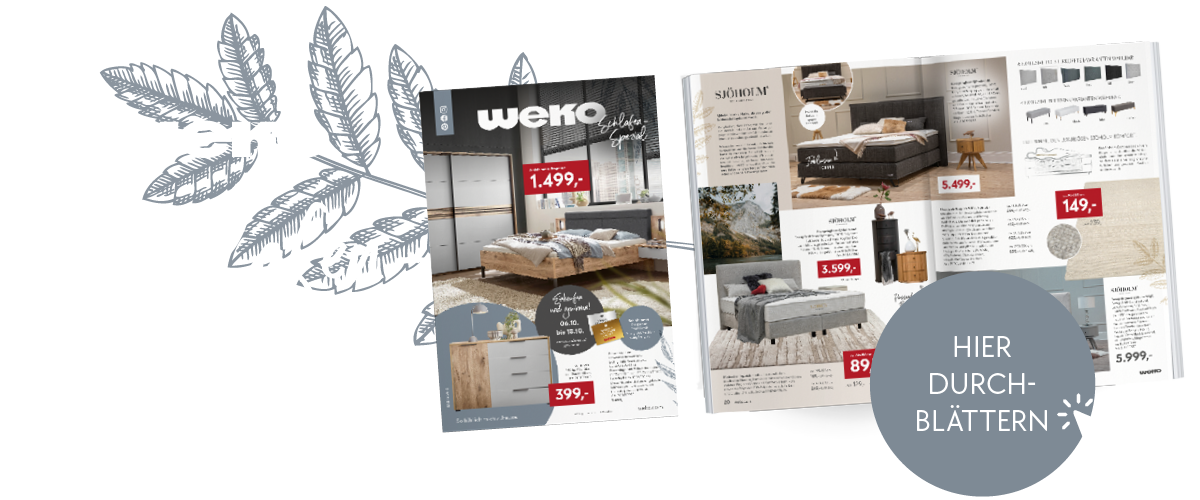 Erholsamer Schlaf ist die Grundlage für Energie, Gesundheit und Wohlbefinden. Mit dem WEKO Schlafen-Spezial haben wir für Sie ein vielfältiges Angebot zusammengestellt, das Ihr Schlafzimmer in eine wahre Wohlfühloase verwandelt. Im aktuellen Prospekt entdecken Sie nicht nur eine große Auswahl an Betten in unterschiedlichen Designs, sondern auch hochwertige Bettwäsche, komfortable Matratzen, Bettdecken & -kissen, sowie Yoga-Accessoires, die für Entspannung und Ausgleich sorgen.