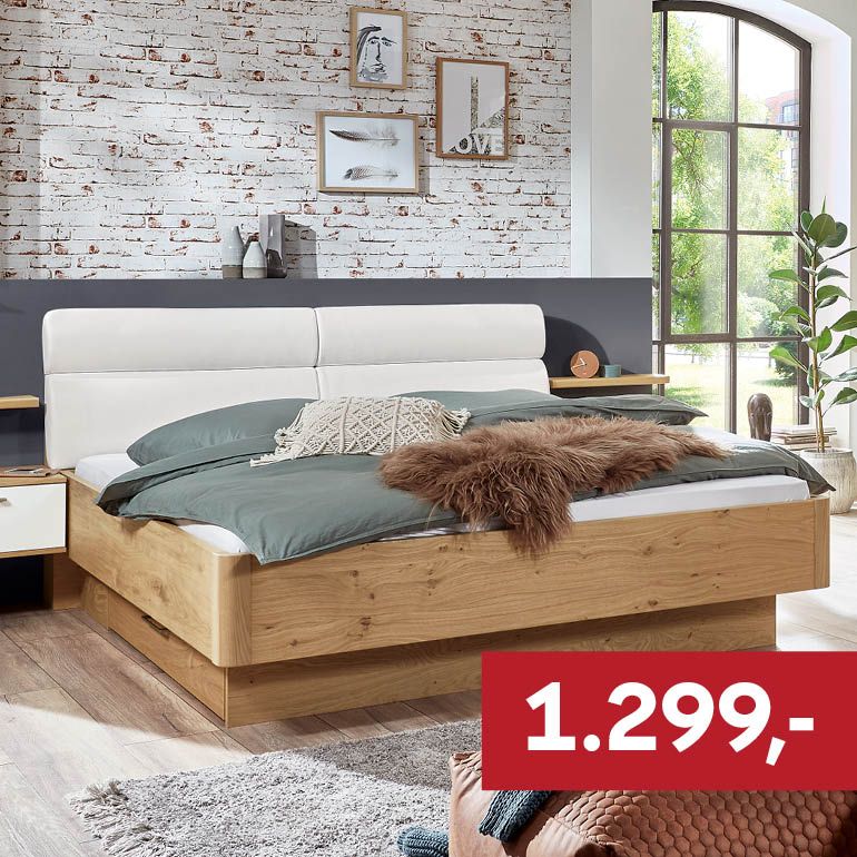Korpus Wildeiche furniert, Polsterkopfteil Bezug Rondo weiß, 88 % Polyurethan, 10 % Polyester, 2 % Nano, Fußteil schwebend mit Rundstollen, Liegefläche ca. 180x200 cm.